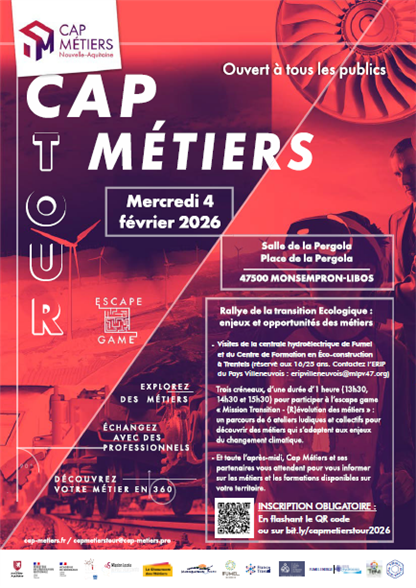 Visite de la centrale hydroélectrique de Fumel et du centre de Formation en éco-construction à Trentels (réservé aux 16/25 ans), Escape Game (13h30, 14h30 et 15h30) et toute l'après-midi, Cap Métiers vous informera sur les métiers et les formations sur votre territoire.