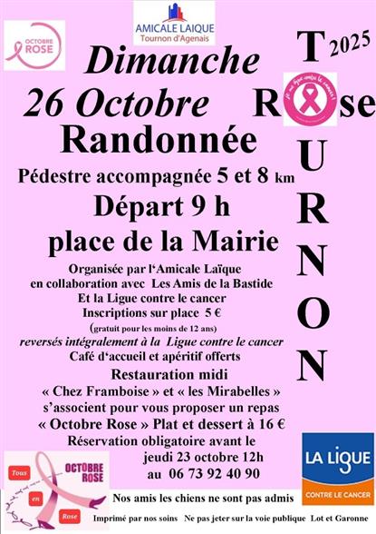 L’ Amicale laïque organise en collaboration avec Les Amis de la Bastide et La ligue contre le cancer une randonnée accompagnée de 5 et 8 km. Départ 9h place de la Marie de Tournon-D'Agenais. Réservation obligatoire avant le jeudi 23 octobre 12h.